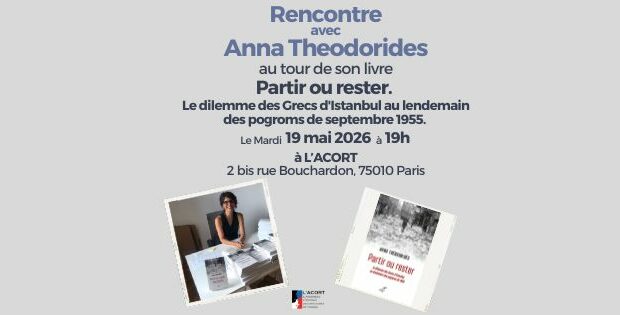 Nous avons le plaisir de vous convier à une rencontre avec Anna Théodoridèsautour de son livrePartir ou rester.Le dilemme des Grecs d’Istanbul au lendemain des pogroms de septembre