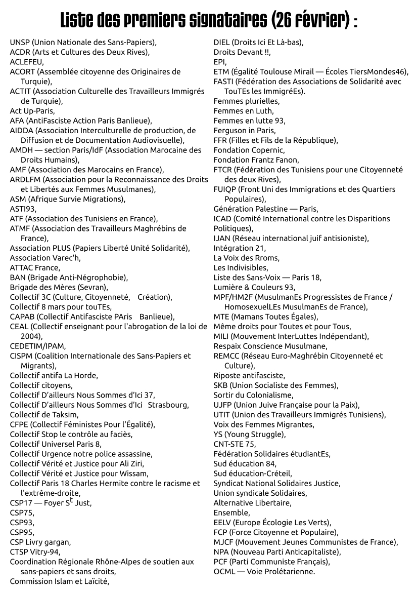 UNSP (Union Nationale des Sans-Papiers) /4ACG (Anciens appelés en Algérie et leurs amis contre la guerre) /ACDR (Arts et Cultures des Deux Rives) /ACLEFEU / ACORT (Assemblée citoyenne des Originaires de Turquie) / ACTIT (Association Culturelle des Travailleurs Immigrés de Turquie) / Act Up-Paris / AFA (Action Antifasciste Paris Banlieue) / AIDDA (Association Interculturelle de production, de Diffusion et de Documentation Audiovisuelle) / Amnesty International Angers / AMDH – section Paris/IDF (Association Marocaine des Droits Humains) / AMF (Association des Marocains en France) / APCV (Agence de promotion des cultures et du voyage) / ARDLFM (Association pour la Reconnaissance des Droits et Libertés aux Femmes Musulmanes) / ASM (Afrique Survie Migrations) / ASTI93 / ATF (Association des Tunisiens en France) / ATMF (Association des Travailleurs Maghrébins de France) / Association Marche pour l’égalite et contre le racisme de 1983 / Association PLUS (Papiers Liberté Unité Solidarité) / Association Varec’h / ATTAC France / BAN (Brigade Anti-Négrophobie) / Brigade des Mères (Sevran) / Capjpo-Europalestine / Collectif 3C (Culture, Citoyenneté, Création) / Collectif 8 mars pour toutES/ CAPAB (Collectif Antifasciste PAris Banlieue) / CEAL (Collectif enseignant pour l’abrogation de la loi de 2004)/ CEDETIM/IPAM / CISPM (Coalition Internationale des Sans-Papiers et Migrants) / Collectif antifasciste 95 / Collectif antifa La Horde / Collectif citoyens / Collectif contre l’islamophobie et les racismes-Paris 20 / Collectif D’ailleurs Nous Sommes d’Ici 37 / Collectif D’ailleurs Nous Sommes d’Ici Strasbourg / Collectif des habitants d’Arcueil contre le FN et les idées d’extrême droite / Collectif de Taksim / CFPE (Collectif Féministes Pour l’Egalité) / Collectif Stop le contrôle au faciès / CUAFA20 (Collectif unitaire antifasciste et antiraciste Paris 20ème) / Collectif Universel Paris 8 / Collectif Urgence notre police assassine / Collectif Vérité et Justice pour Ali Ziri / Collectif Vérité et Justice pour Wissam / Collectif Paris 18 Charles Hermite contre le racisme et l’extrême-droite / CSP17-Foyer St Just / CSP75 / CSP93 / CSP95 / CSP Livry gargan / CTSP Vitry-94 / Coordination Régionale Rhône-Alpes de soutien aux sans-papiers et sans droits / DIEL (Droits Ici Et Là-bas) / Droits Devant!! / ENAR (Réseau européen de lutte contre le racisme) / EPI (Etudiants Pacifistes Internationaux) / ETM (Egalité Toulouse Mirail – Ecoles TiersMondes46) / FASTI (Fédération des Associations de Solidarité avec Tou-te-s les Immigré-e-s) / Femmes plurielles / Femmes en Luth / Femmes en lutte 93 / Ferguson in Paris / FFR (Filles et Fils de la République)/ Fondation Copernic / Fondation Frantz Fanon / FTCR (Fédération des Tunisiens pour une Citoyenneté des deux Rives) / FUIQP (Front Uni des Immigrations et des Quartiers Populaires) / Génération Palestine – Paris / ICAD (Comité International contre les Disparitions Politiques) / IJAN (Réseau international juif antisioniste) / Intégration 21 / La Voix des Rroms / Les Indivisibles / Liste des Sans-Voix-Paris 18 / Lumière & Couleurs 93 / MPF/HM2F (Musulman-e-s Progressistes de France / Homosexuel-le-s Musulman-e-s de France) / MTE (Mamans Toutes Egales) / Même droits pour Toutes et pour Tous / Mouvement du Christianisme Social/ MILI (Mouvement InterLuttes Indépendant) / Respaix Conscience Musulmane / REMCC (Réseau Euro-Maghrébin Citoyenneté et Culture) / Riposte antifasciste / SKB (Union Socialiste des Femmes) / Sortir du Colonialisme / UJFP (Union Juive Française pour la Paix) / UTIT (Union des Travailleurs Immigrés Tunisiens) / Voix des Femmes Migrantes / YS (Young Struggle) / CNT-STE 75 / Fédération Solidaires étudiant-e-s / Solidaires 84 / Sud éducation 84/ Sud éducation 89 / Sud éducation-Créteil / Sud éducation Mayotte / Syndicat National / Solidaires Justice / UNEF Le Mans / Union Départementale CGT Paris / Union syndicale Solidaires / VISA (Vigilance et Initiatives Syndicales Antifascistes) / Alternative Libertaire / CGA (Coordination des Groupes Anarchistes) / Ensemble / EELV (Europe Ecologie Les Verts) / FCP (Force Citoyenne et Populaire) / Jeunes Pirates / Les Alternatifs / MJCF (Mouvement Jeunes Communistes de France) / NPA (Nouveau Parti Anticapitaliste) / PCF (Parti Communiste Français) / OCML-Voie Prolétarienne / Solidarité communiste