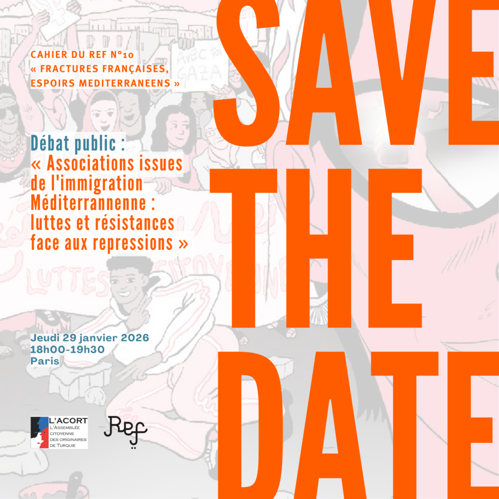 Le REF-Réseau Euromed France en partenariat avec L’ACORT (L’Assemblée Citoyenne des ORiginaires de Turquie) organise un débat public dans le cadre de la promotion du Cahier n°10 du REF intitulé « Fractures françaises, espoirs méditerranéens luttes citoyennes et héritage de l’immigration » qui regroupe les témoignages d’organisations issues des différentes diasporas méditerranéennes en France.